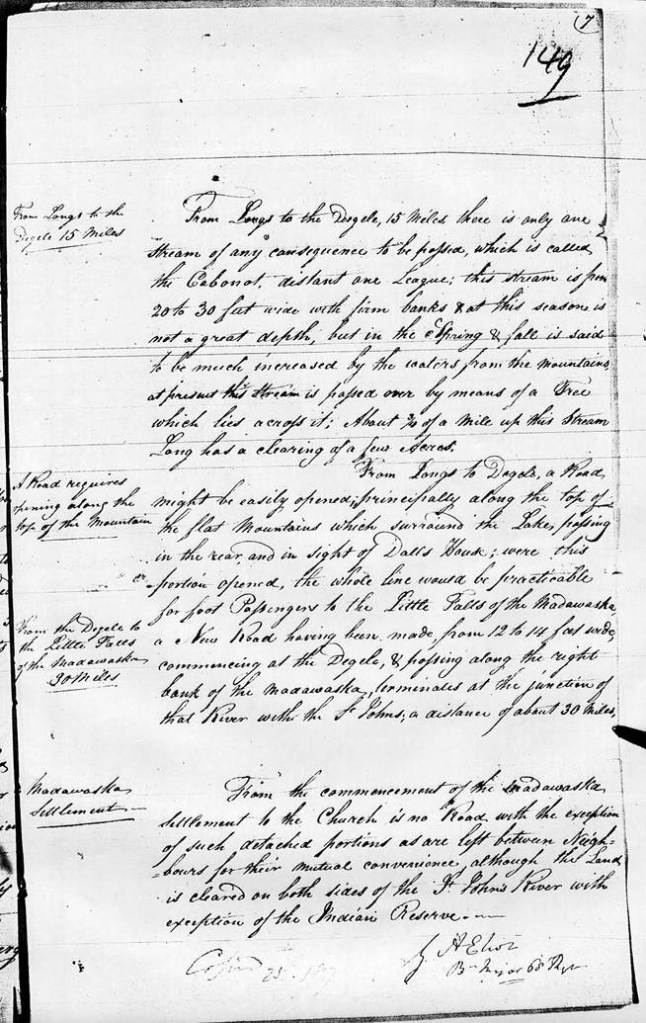 Figure 143 – Extrait du rapport Elliott – « Ce poste se trouve sur la portion de la seigneurie de Timiscouata appartenant au colonel Fraser et est également sujet aux inconvénients mentionnés ci-dessus. »