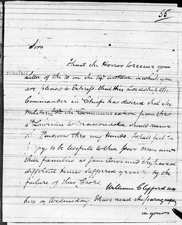 William Clifford était ici mercredi. J’ai lu le paragraphe de votre lettre l’autorisant à commencer la construction de sa maison près du pont de la Grande Fourche demain. Il a une femme et trois enfants. Sa pension est d’un shilling par mois. Il y a un pensionné à la rivière Trout, près de Madawaska, qui, je suppose par inadvertance, a été omis de la liste des pensionnés que vous avez eu l’amabilité de m’envoyer. Il s’appelle Louis Stripman. Il a une femme. Sa solde est de six pence par mois. Philip Long (et non Luke Long) n’est, je suppose, pas considéré comme un colon. Il est placé ici par le directeur général des postes.