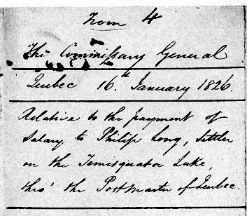 Long, Philip, sur la liste des pensionnés. Non considéré comme colon ; inscrit par le directeur général des postes. Lac Témiscouata, 21 septembre 1823. (C. 198, p. 56)