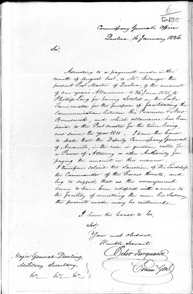 Figure 139 – Lettre de Peter Durquand, commissaire général, datée du 16 janvier 1826, Québec, au colonel Darling, secrétaire militaire.