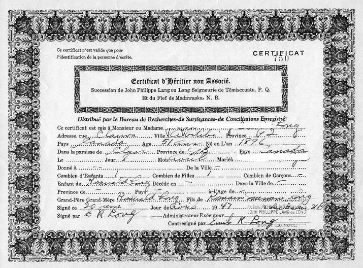 Figure 131 – Certificat d’Héritage – La Légende de la Longue Fortune – 1947. Source : Doris Long