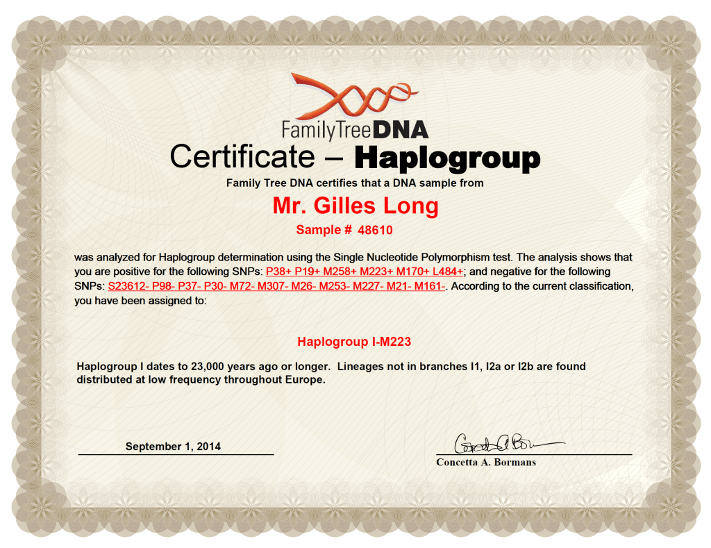 - Un plus grand raffinement de notre lignée génétique a été mis d’avant lorsque Gilles Long a passé le test le plus évolué à ce moment, soit le test BY700 de Family Tree DNA; c’est un cadeau pour la famille car nous n’avons pas besoin de faire nos propres tests car celui-là sert à tous descendants de Philip Long dans la ligné mâ de la famille;