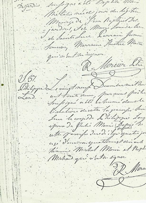 Le vingt neuf décembre mil huit cent trente-deux, par nous prêtre soussigné, a été inhume dans le cimetière de la Paroisse Sainte Luce le corps de Philippe Long époux de Julie Marie Depré de cette paroifse décédée il y a quatres jours agé d’environ quatre vingt six ans. Témoins Michel Morin et Rapahel Michaud qui n’ont pu signer.