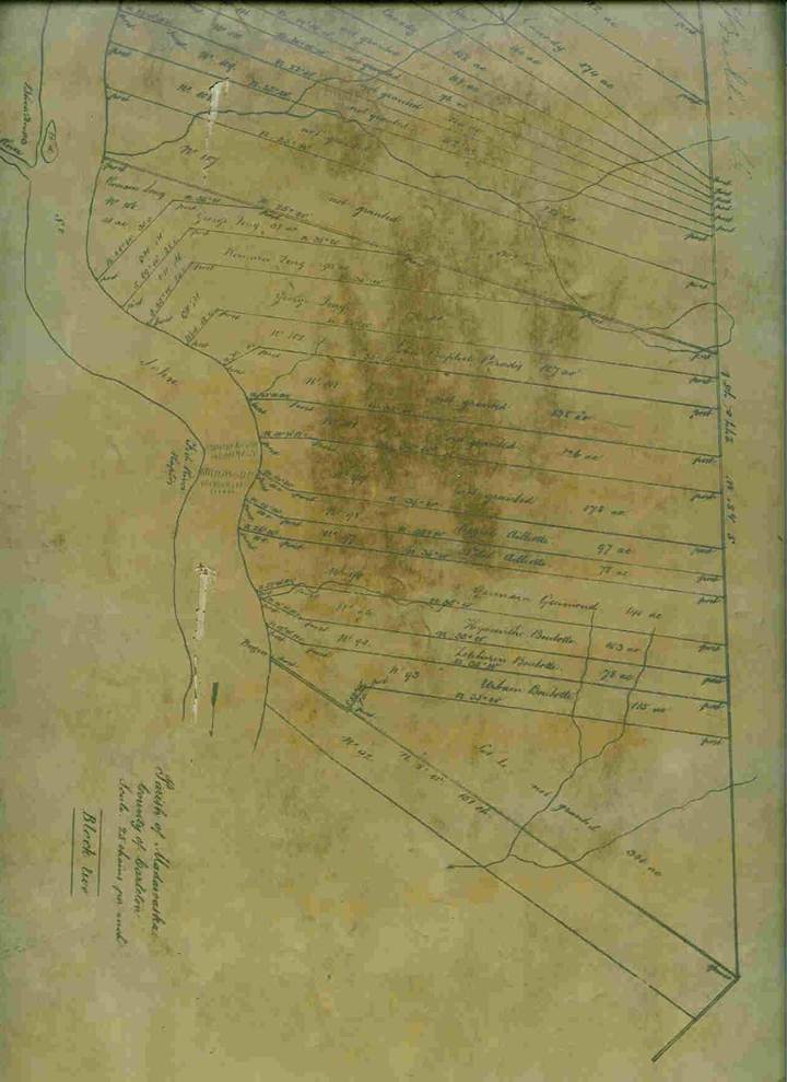 Figure 154 – Carte mise à jour au milieu des années 1950 des concessions originales des premiers colons à Clair, Nouveau-Brunswick – 1848